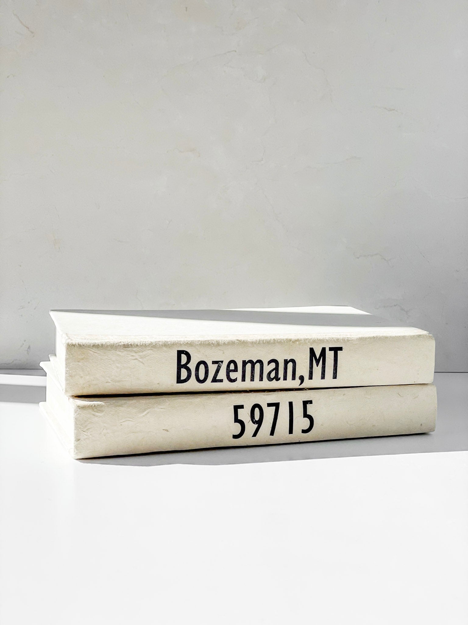 Celebrate your love for Bozeman with the charming Decorative Book Stack from E. Lawrence, Ltd. This delightful set features two thoughtfully designed books, each adorned with elegant black lettering on a textured grass cloth spine. One book proudly displays "Bozeman, MT," while the other showcases the zip code "59715," encompassing the vibrant communities of West End, Bridger, Patterson, and Camona.