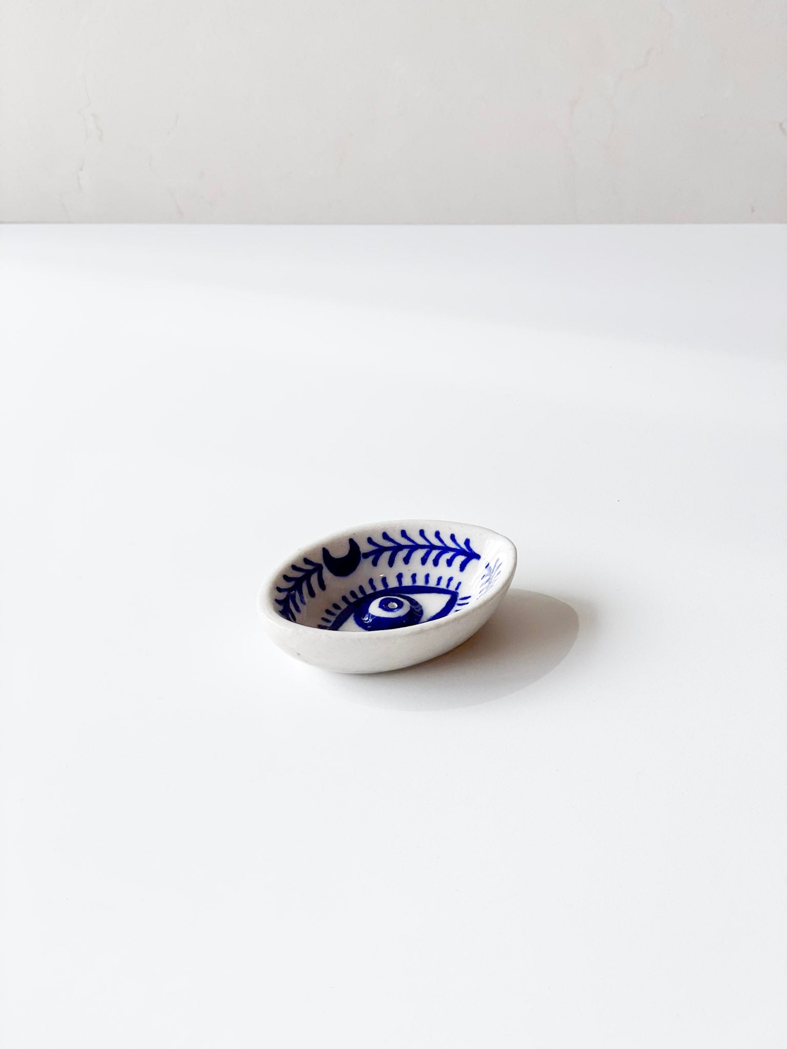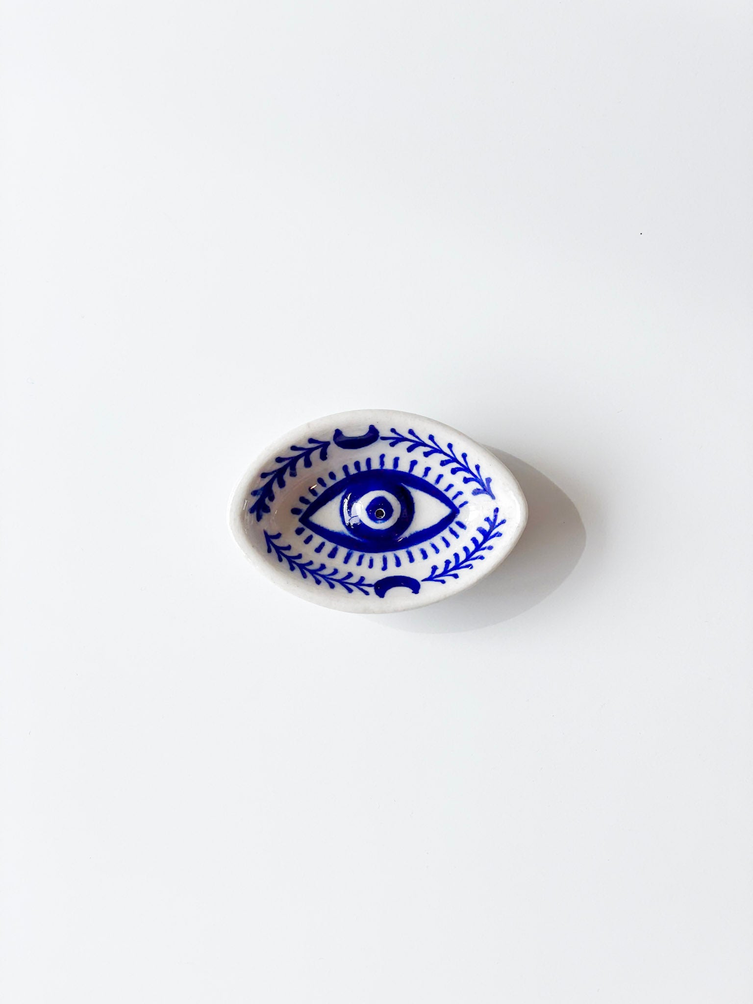 Elevate your space with the enchanting charm of the Evil Eye Incense Holder from MATR BOOMIE. This exquisite piece features the renowned hand painting of Jaipur's blue pottery artisans—a tradition steeped in generations of craftsmanship. The intricate, traditional art form is seamlessly integrated into a modern design, bringing the timeless symbol of the evil eye to life with beauty and functionality.