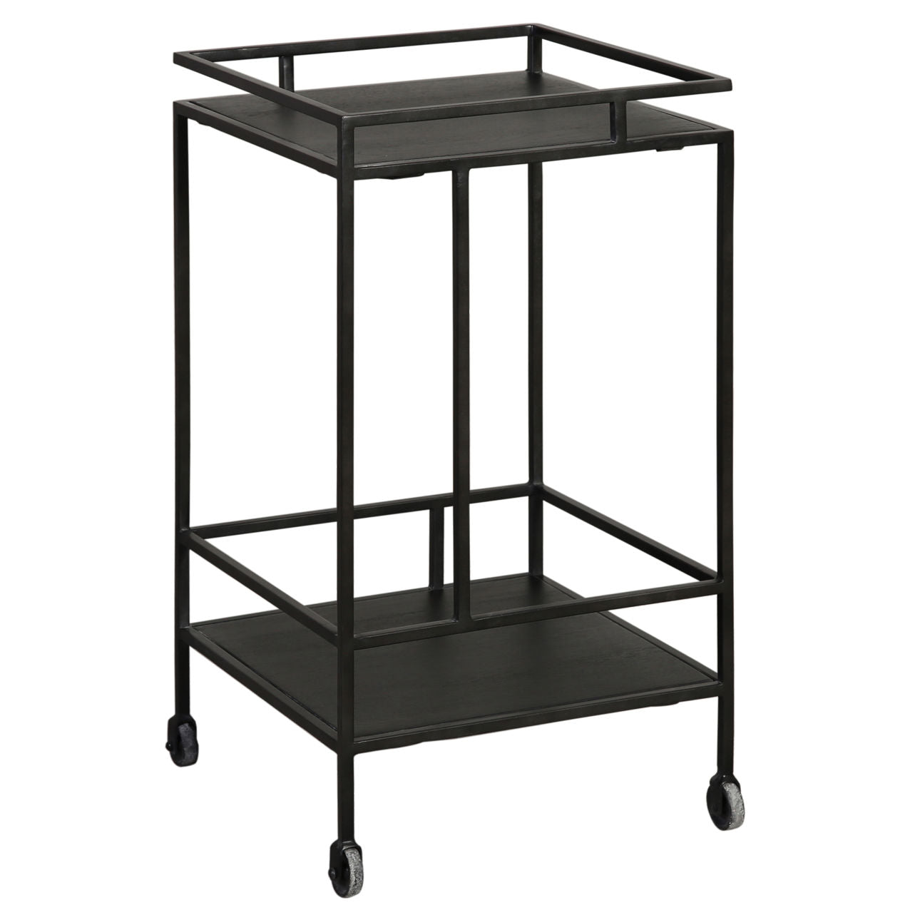 Introducing the Evita Bar Cart from Dovetail Furniture, a stunning blend of industrial chic and timeless elegance that promises to elevate your home bar experience. Crafted with precision and care, this bar cart features a sleek iron frame with a sophisticated black finish, perfectly complemented by the warmth of black coated oak shelving.
