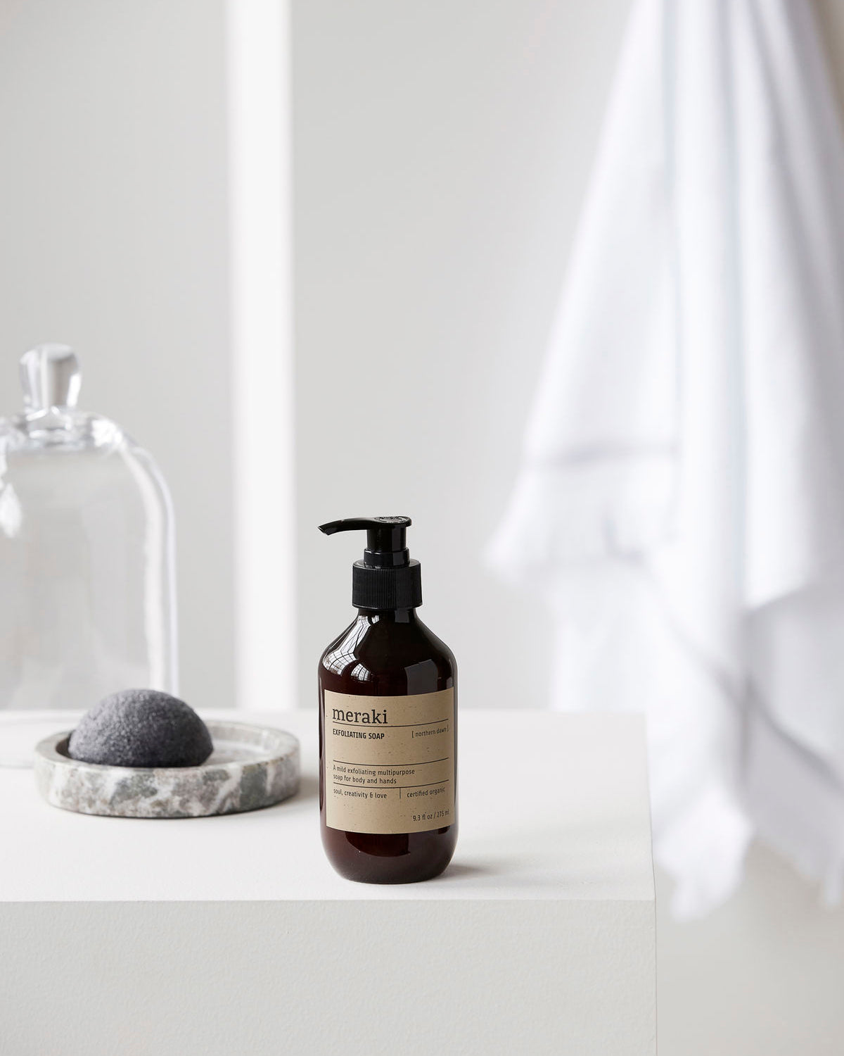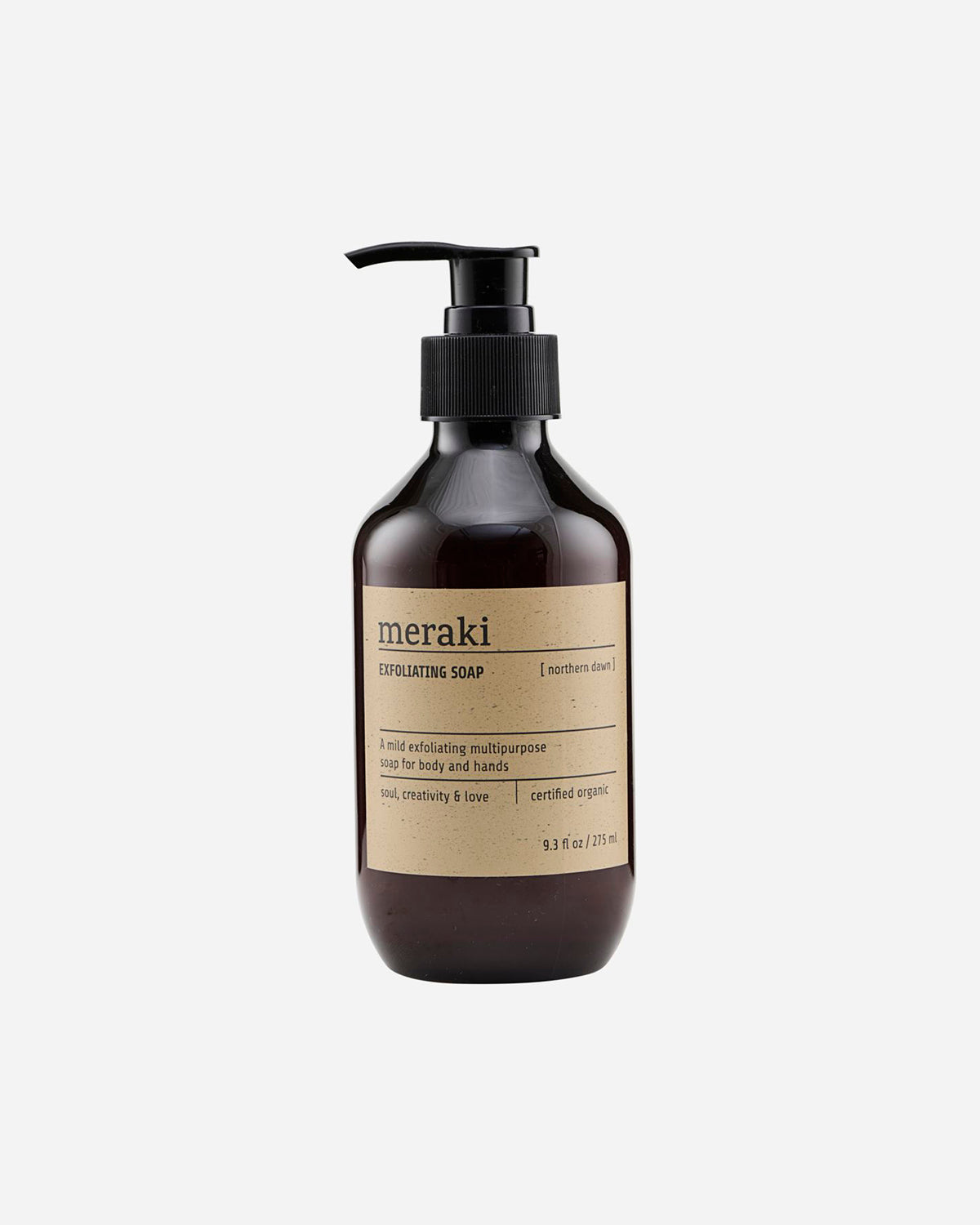Wash your hands and get a gentle exfoliating effect with this certified organic exfoliating hand soap from Meraki. A granulate of apricot and rice seeds gently remove dead skin cells and leave your hands soft and smooth (don't worry, this isn't like the apricot scrub we all knew and used in the 90's). The Exfoliating Soap gets its moisturising effect from organic aloe vera and glycerine which also smooths and softens your skin. To further soothe your skin, organic calendula contributes with flavonoids - an antioxidant which protects your skin against the damaging effect of free radicals. Your hands are left clean, soft and nourished.