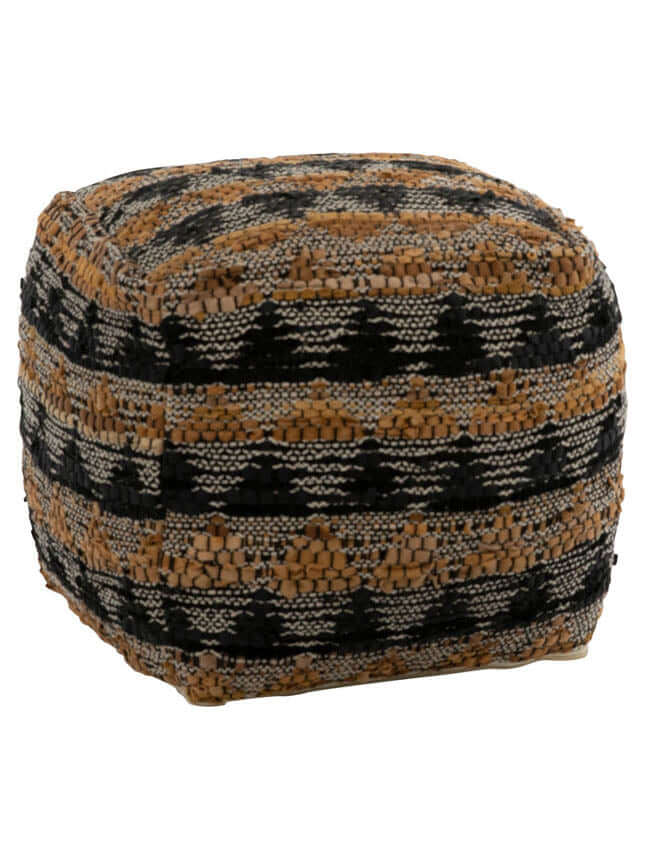 Ajoutez de la chaleur et de la texture aux espaces grands et petits avec ce pouf ottoman parfaitement carré. Présentant des motifs tribaux noirs et marrons utilisant du cuir suédé tissé à la main de haute qualité et un remplissage de perles de polystyrène. Ce pouf carré de 16" x 16" est la touche finale parfaite à n'importe quelle pièce de votre maison.