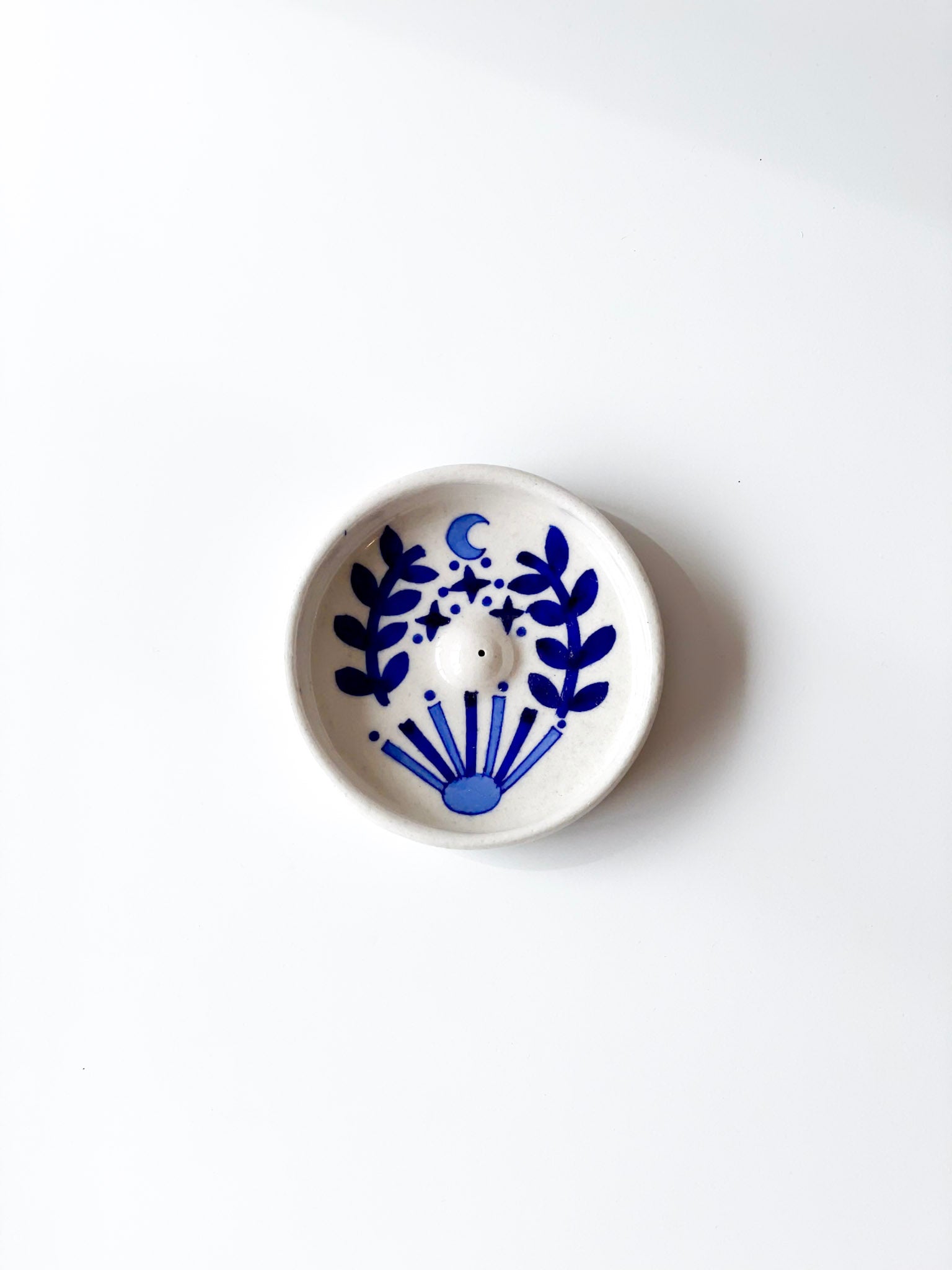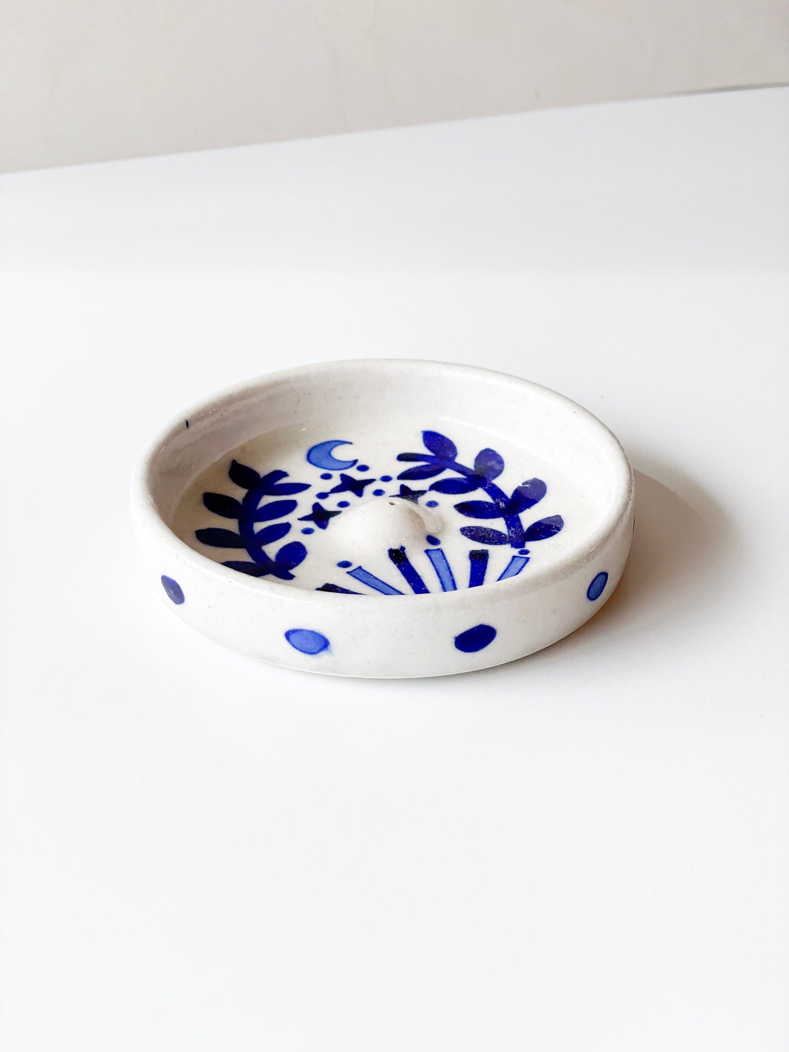 Discover the organic elegance of the Hand Painted Round Incense Holder from MATR BOOMIE. Adorned with the signature hand painting of Jaipur's blue pottery artisans, this piece embodies a centuries-old craft that has been cherished and refined through generations. The intricate traditional art form is beautifully harmonized with a contemporary design, making it a striking addition to any space.
