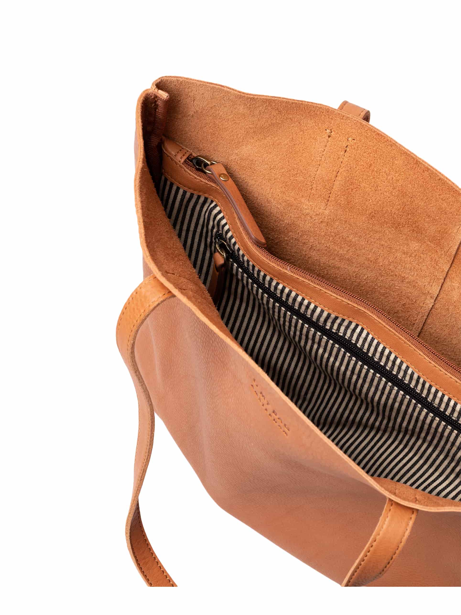 L'intérieur du sac est équipé d'un bag-in-bag en coton qui peut être fermé par une fermeture éclair pour garder tous vos objets de valeur en sécurité. Ce sac intérieur présente nos rayures noires et blanches emblématiques et ses poches intérieures plaquées et une grande poche zippée vous offrent tous les outils d'organisation dont vous avez besoin. Cet article a été fabriqué à la main avec du cuir écologique au tannage végétal. Le ton Wild Oak donne un aspect et une sensation sophistiqués et luxueux.