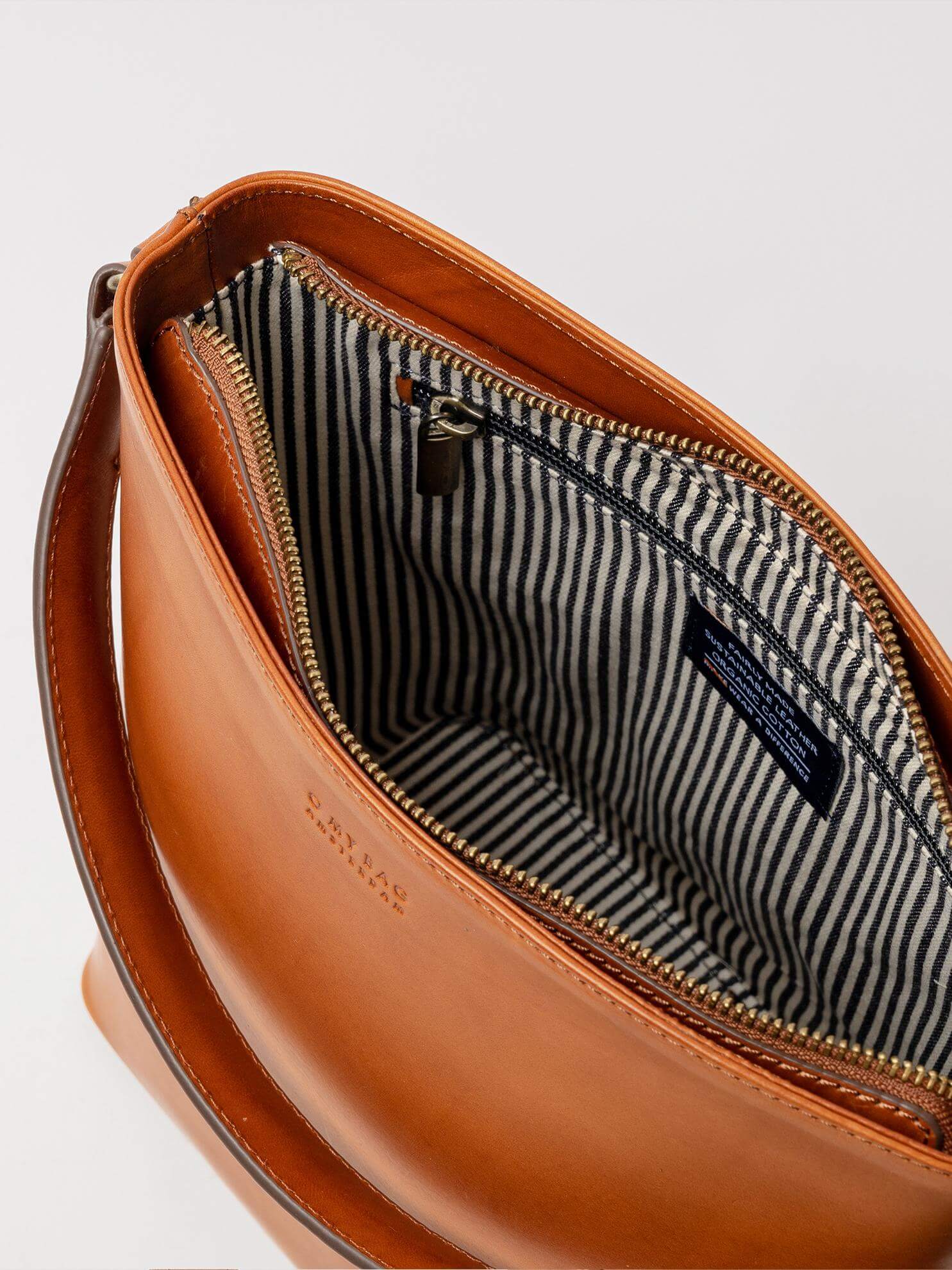 Details: Comes with 2 straps, 1 short full leather strap and 1 long full leather strap. Large inside compartment, complete with antique brass hardware. Feature's O My Bag's signature cotton striped interior lining. Includes dust bag for storage.