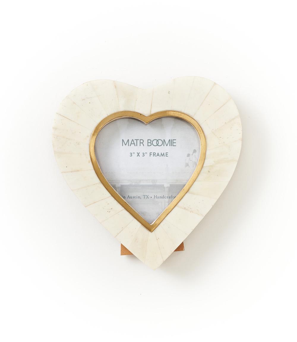 This hand carved picture frame features ethically sourced, cruelty free bone tile in a heart shape with brass accents. For convenient display this photo frame features a one-way table top easel. Frame accommodates 3x3 photo or print, easily accessed with metal swivel tabs and removable back.