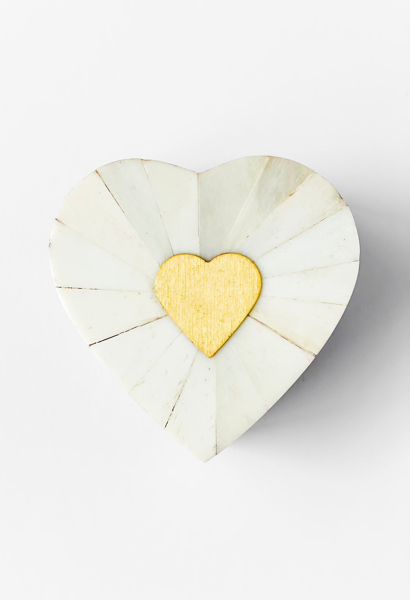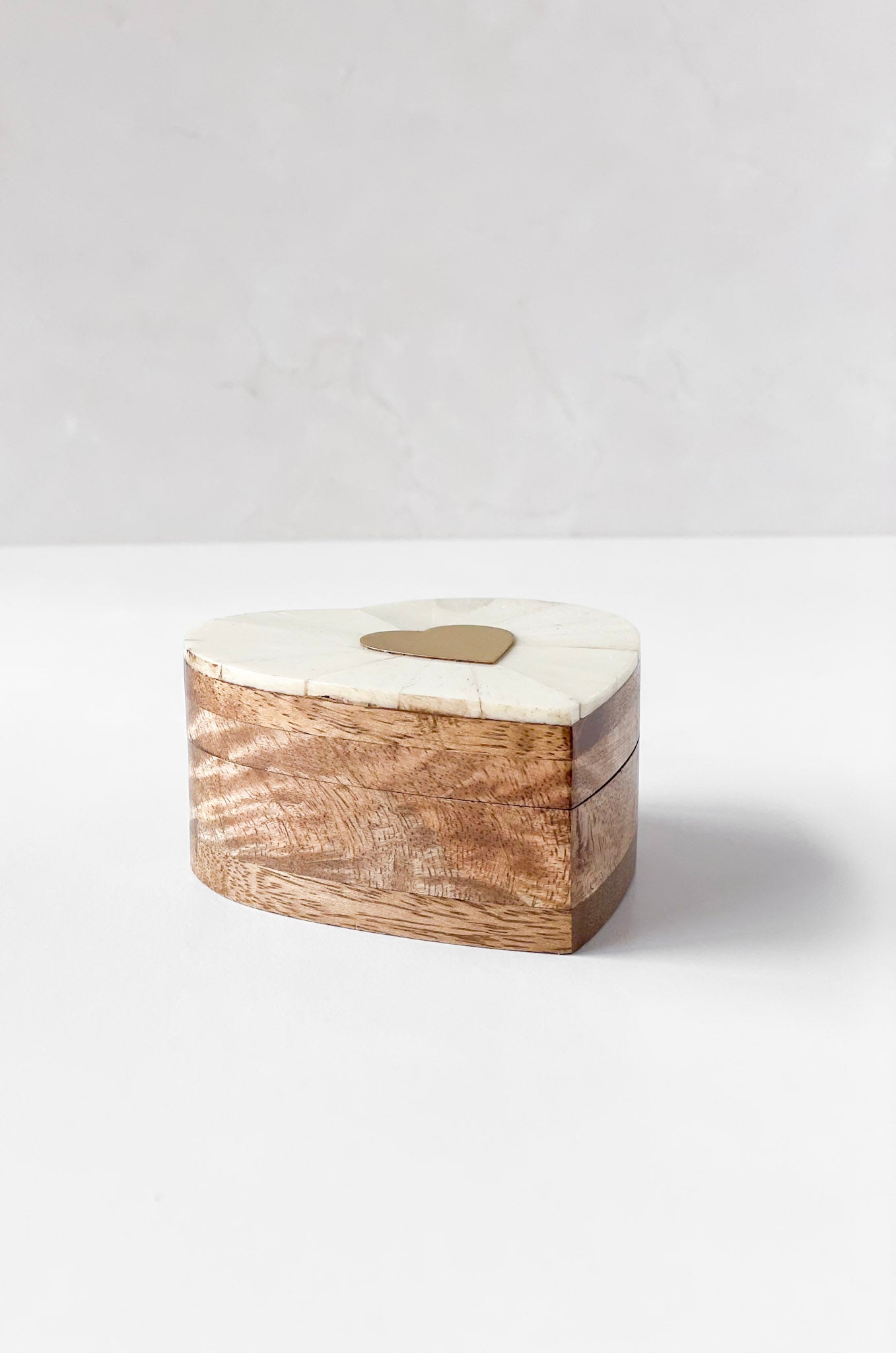 Each box is meticulously crafted from sustainably harvested mango wood, ensuring both beauty and eco-consciousness. The lid features a delicate design of ethically sourced bone tiles, expertly carved to extend gracefully from a central heart charm to the rounded edges of the box. At the center of the lid, a shiny brass heart charm, finished with gold, adds a touch of sophistication and warmth.