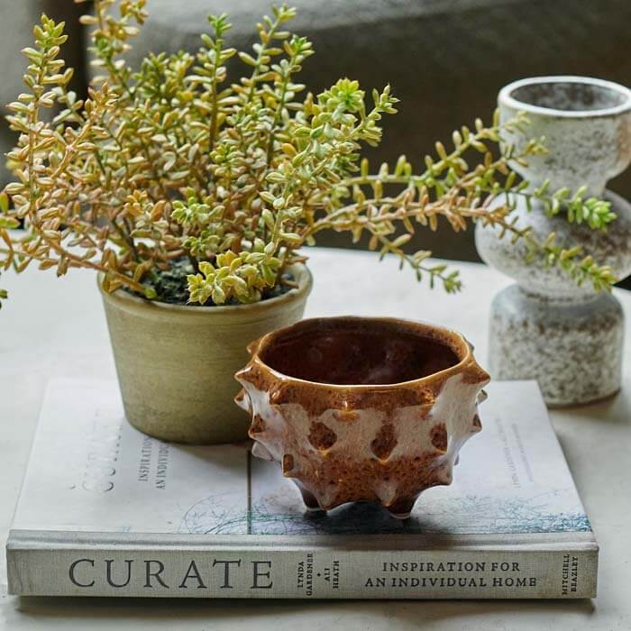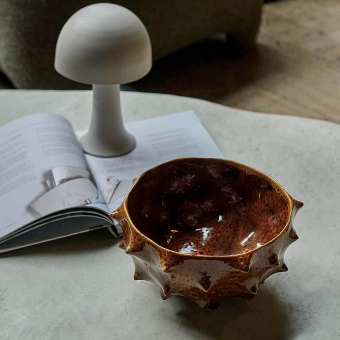 Meet the Kiwano Bowl from Abigail Ahern, a distinctive and captivating addition to your home decor collection. Unlike any other decorative bowl you've encountered, the Kiwano Bowl exudes an exotic charm reminiscent of a textural tropical fruit. Its surface, adorned with spikes, accentuates the unique materiality of this piece, making it a true standout.
