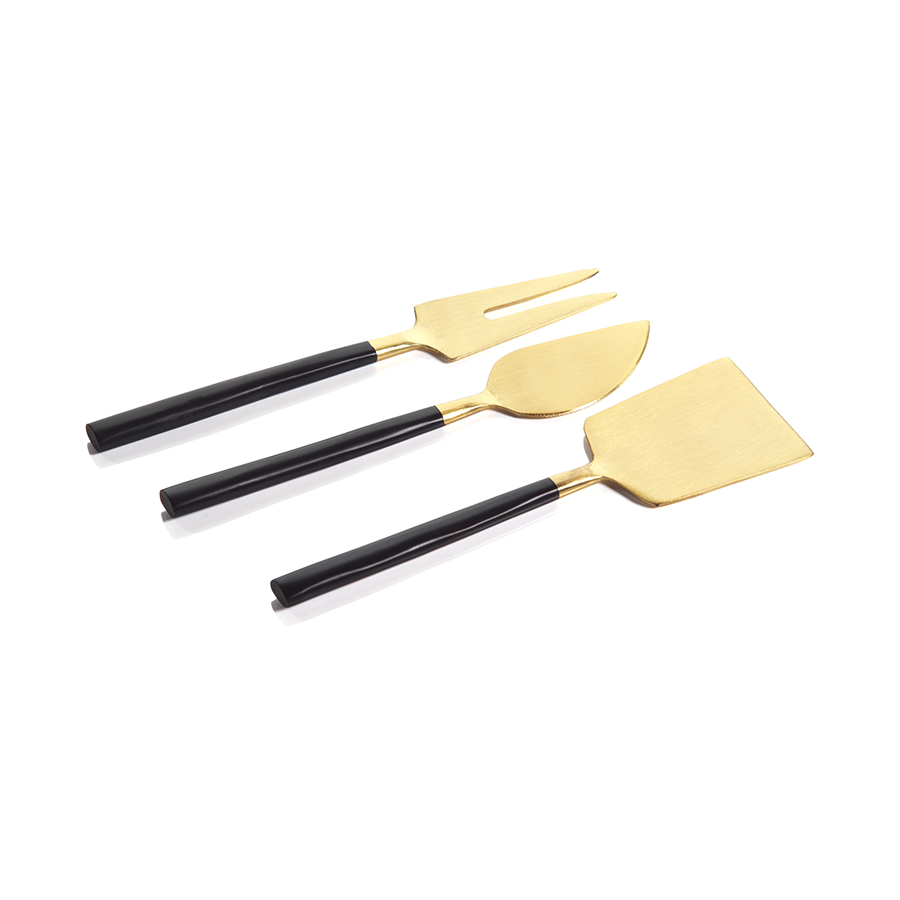 Introducing our exquisite set of 3 black and gold stainless steel cheese knives, the epitome of sophistication and refinement for your kitchen and serveware collection.