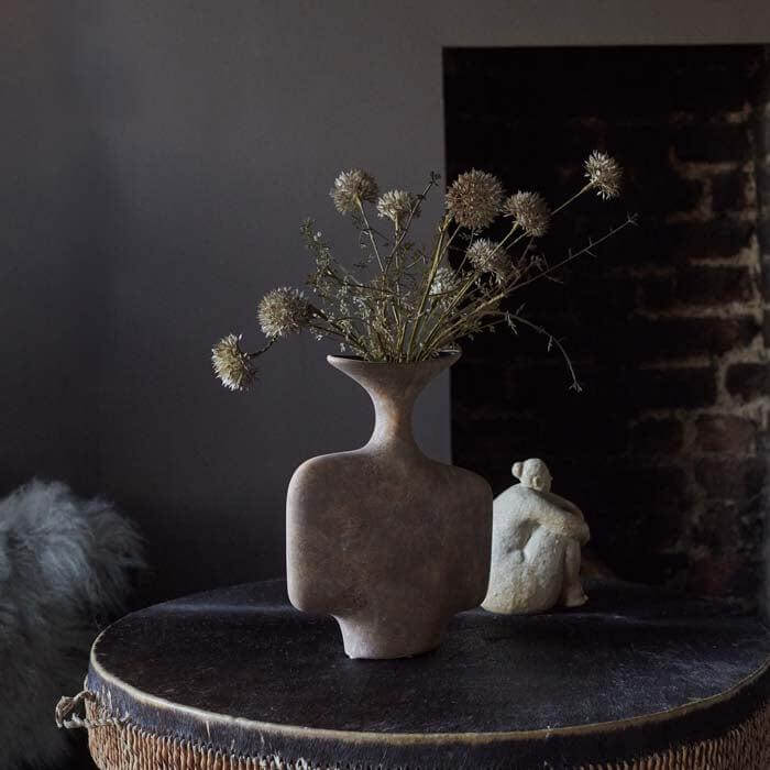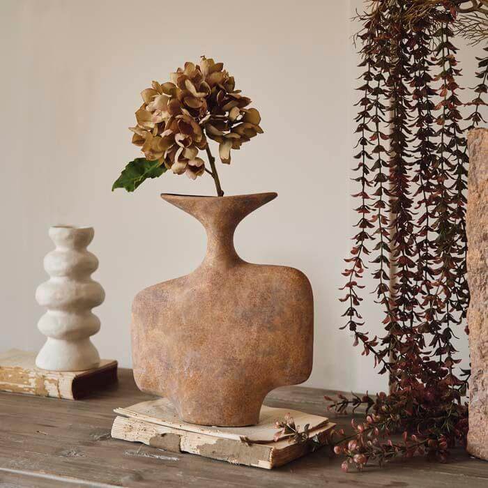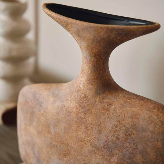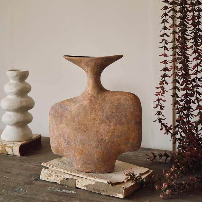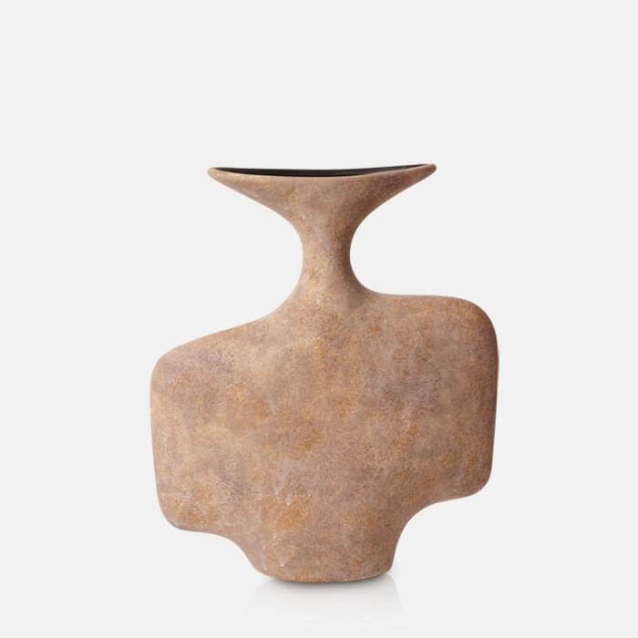 The Nantou Vase's wide, abstract shape and textured terracotta hue exude an artful vibe that transcends trends, offering timeless style to any space. Its distressed surface adds an extra layer of character, giving it a unique and weathered look that speaks to its artisanal quality.