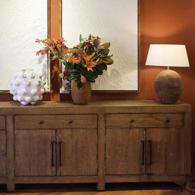 We love styling on light or white toned dressers, consoles, and sideboards. Love something moodier? Try it on a black console or sideboard with a statement vase and dried florals for a dramatic statement.