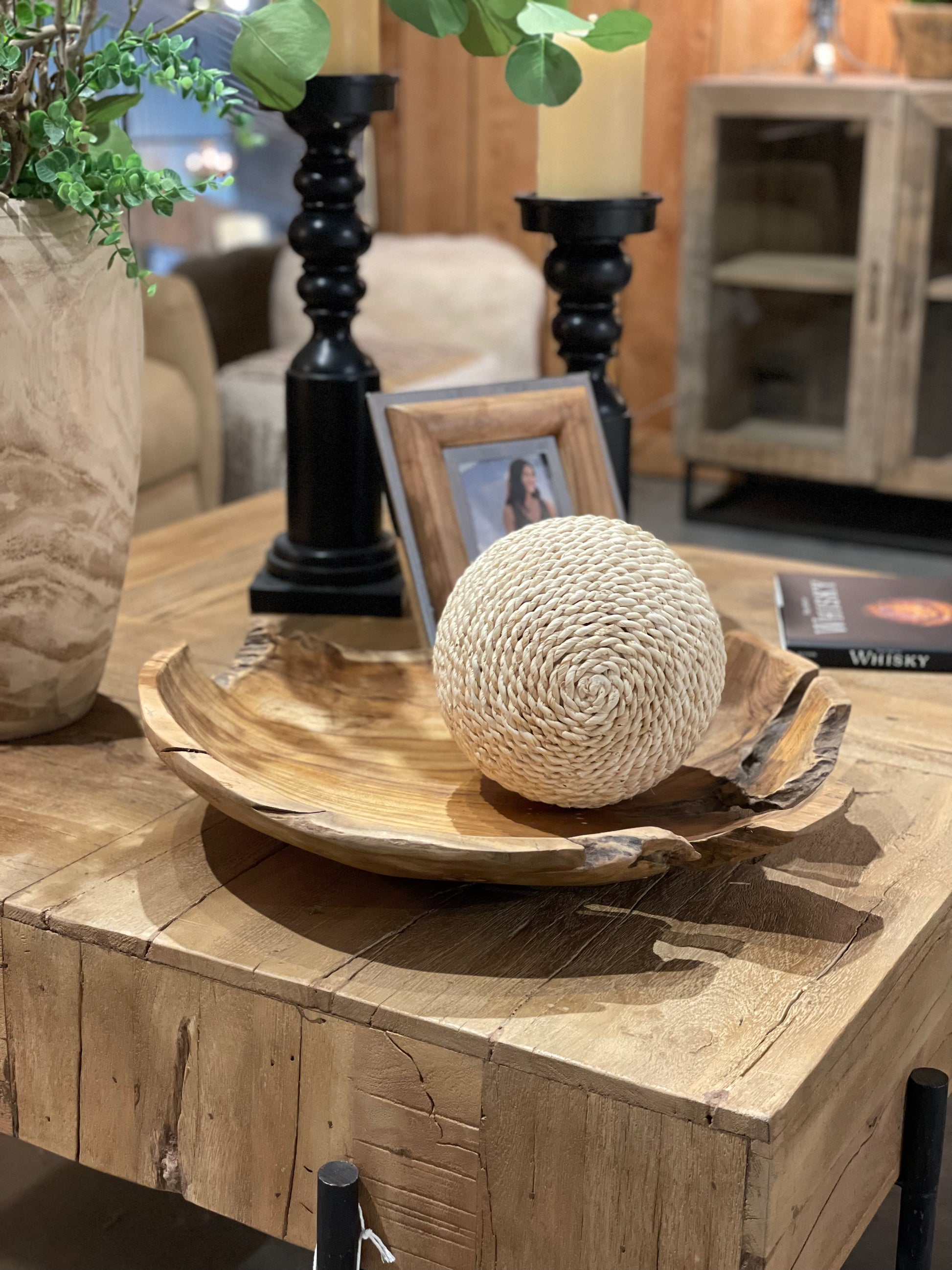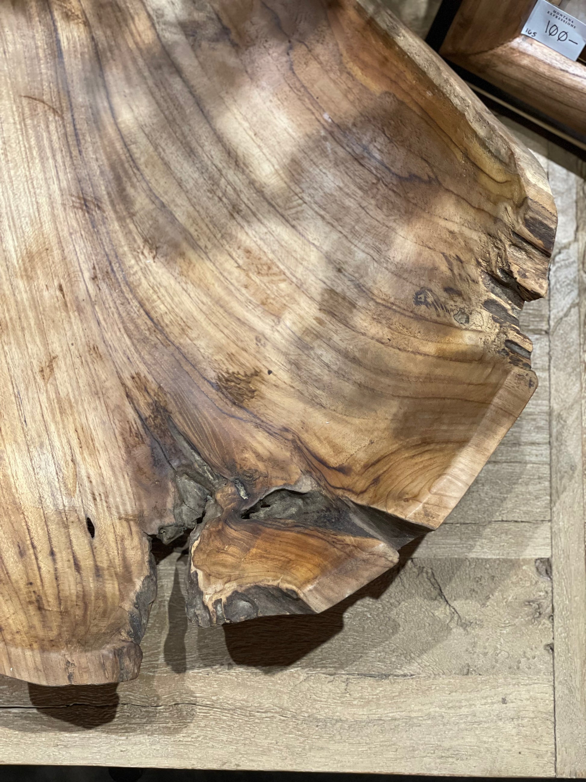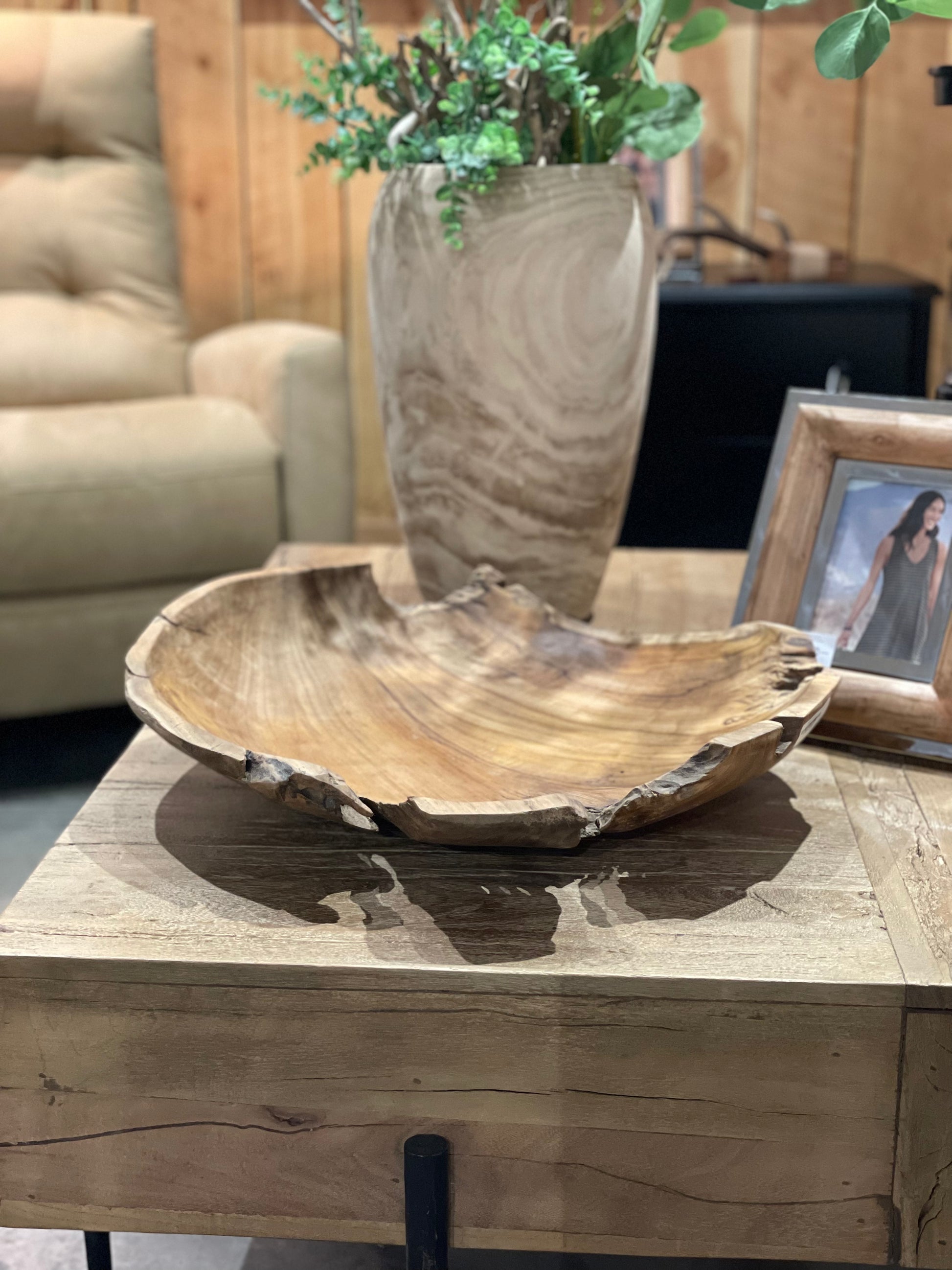 With its organic shape and natural variations of color and pattern, this 20” live-edge teakwood bowl creates a stunning way to serve bread or fruit or is perfect for holding keys, sunglasses, or jewelry. This bowl is artisan made, making each piece a unique work of art.