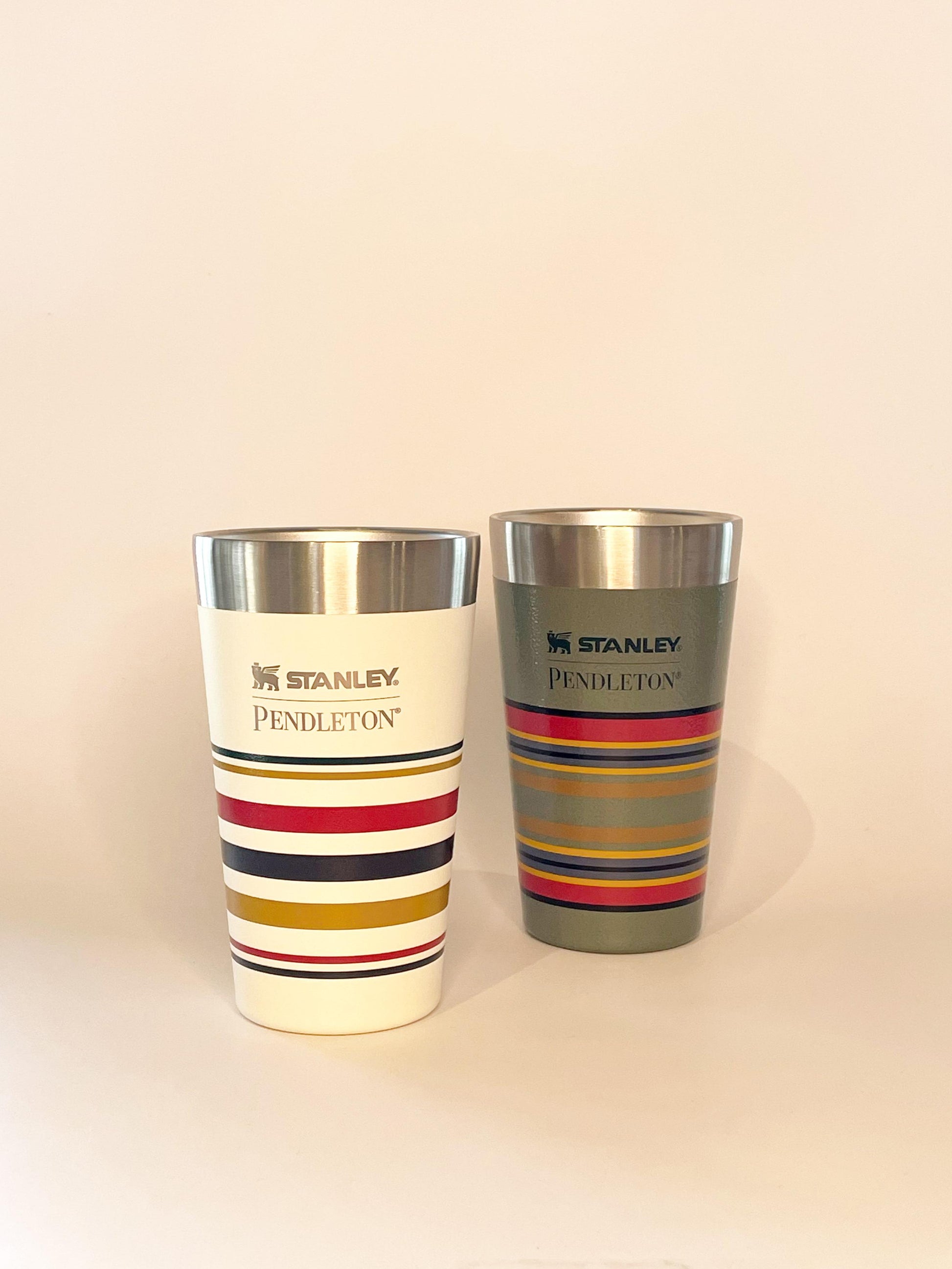 Set of two 16-oz. pint cups from Stanley® x Pendleton. Constructed from sturdy, BPA-free stainless steel, this drinkware is vacuum-insulated to keep beverages colder longer. Perfect for camp or cabin, they won't break, shatter or rust, and stack together for easy storage. Set includes one cup in in each pattern, based on Pendleton's National Park and Yakima Camp Stripes, created with an improved printing process that keeps the colors vivid, wash after wash.