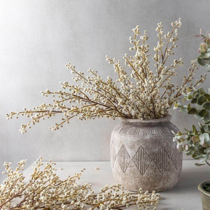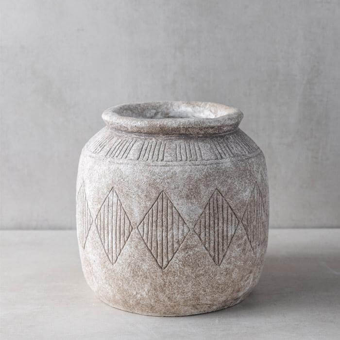 Made from natural-hued stoneware, the Tarla Vase boasts a captivating rustic look that adds warmth and character to any space. Its intricate geometric pattern, reminiscent of Romanesque design, lends an air of sophistication and heritage.