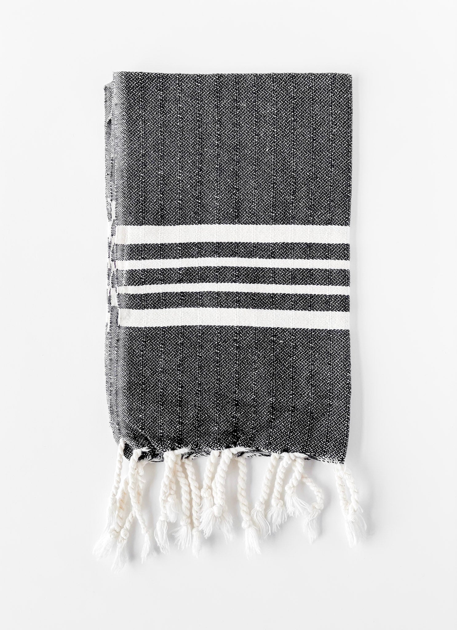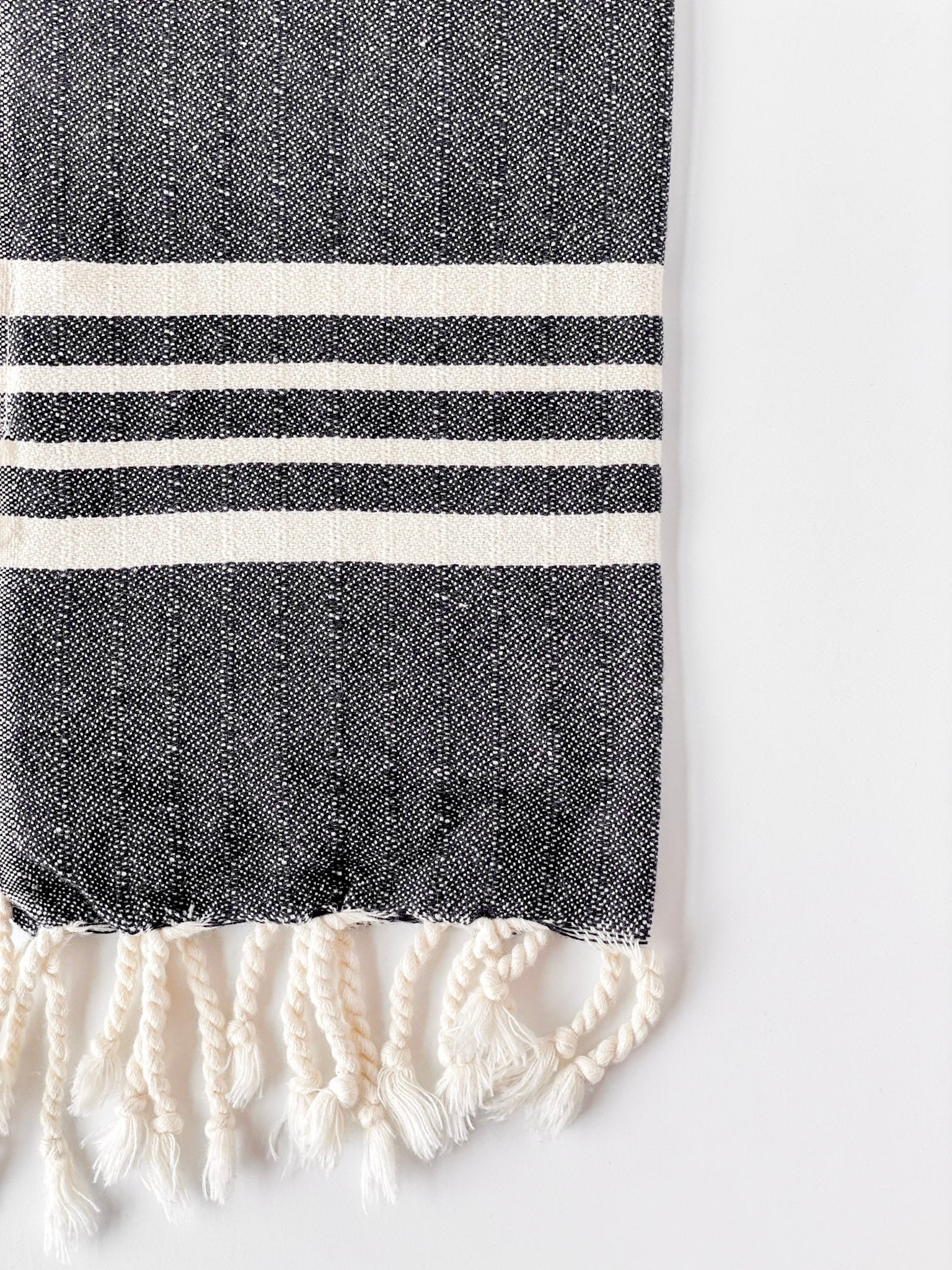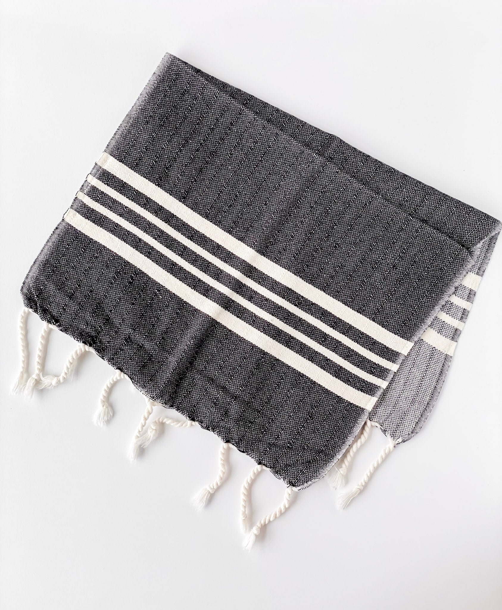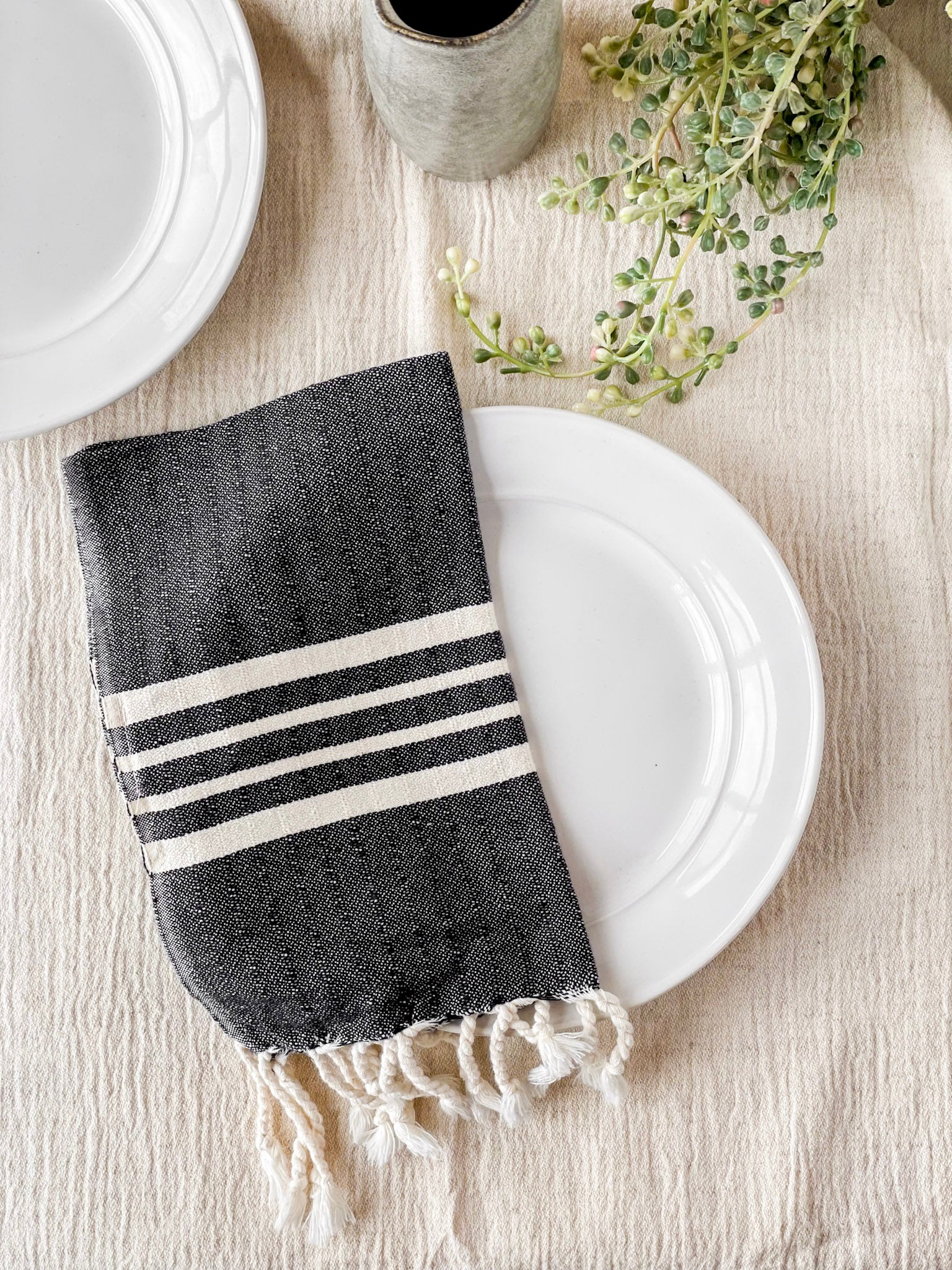 Effortlessly upgrade your table with this Turkish Cotton Napkin, a perfect blend of elegance and functionality for your dining experience. Crafted from 100% premium Turkish cotton, this napkin is designed in classic black with four crisp white stripes adorning each end, complemented by delicate white tassels for a touch of laid back sophistication.