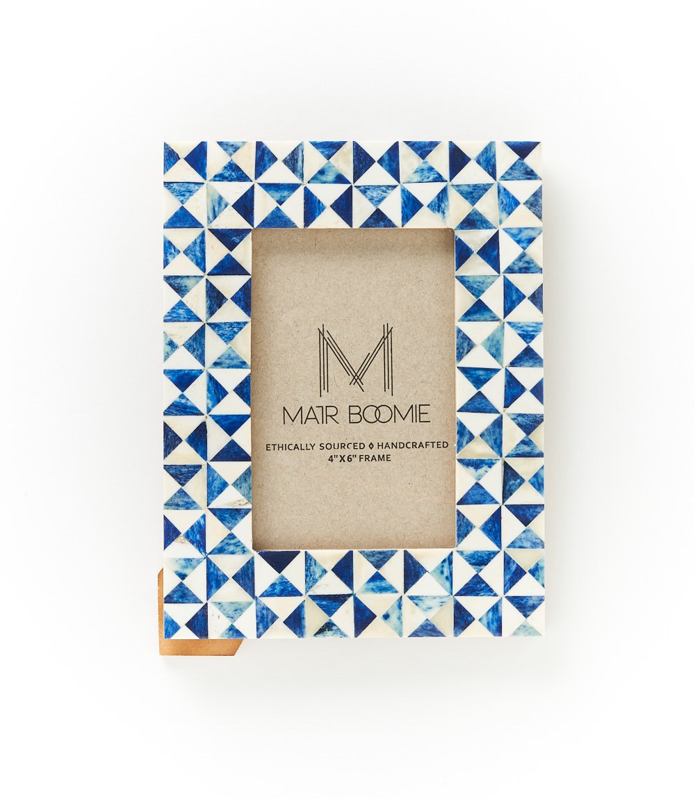 The Varuna frame incorporates traditional Indian art forms in modern, sea-inspired designs handcrafted from ethically sourced bone tile. Master artisans in Old Delhi skillfully hand carve bone elements to create unique, eye-catching mosaic designs. This handcrafted photo frame is thoughtfully designed for stylish display, featuring a geometric wave motif mosaic combining hand carved bone tiles in pearly white and cobalt blue. The picture frame accommodates 4x6 photo or print and features iron latches for frame closure and sturdy leg on the back to keep upright.