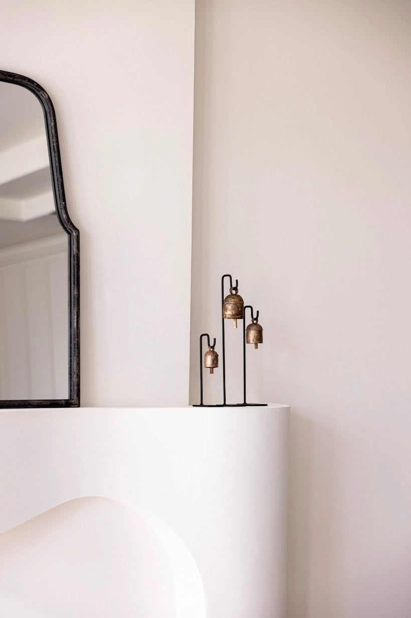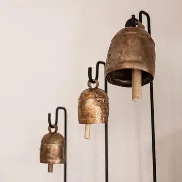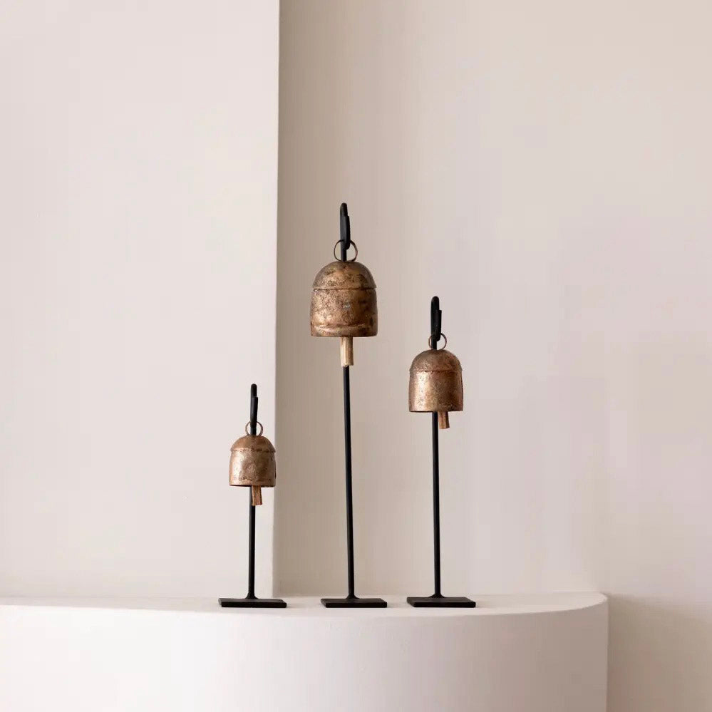 Add timeless charm to your home with this set of Vintage Inspired Iron Bells on Stands. Perfect for year-round shelf styling, these unique bells bring a touch of antique allure to any space. Crafted by hand from durable iron, each bell features a welded hook and a beautifully aged patina copper brass finish that enhances its vintage appeal. The bells are intentionally imperfect, with subtle variations in shape that capture the essence of antique craftsmanship and natural aging.
