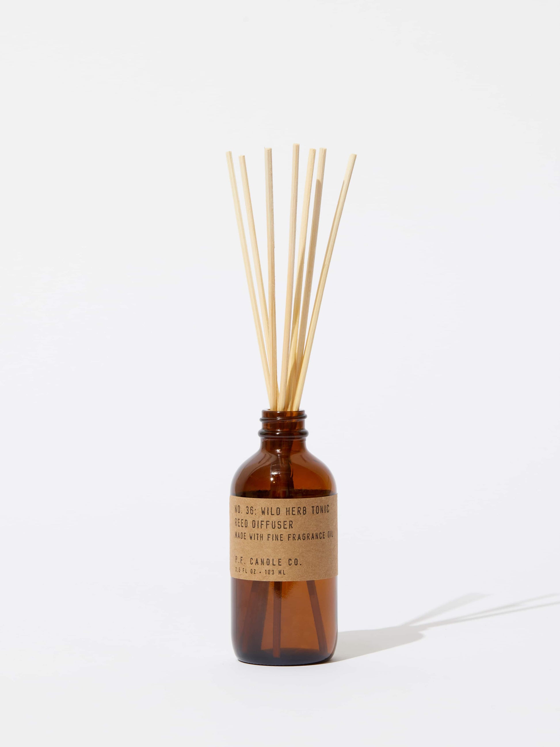 P.F. Candle Co.'s Reed Diffusers come in apothecary-inspired amber glass bottles with their signature kraft label and rattan reeds. Low-maintenance scent throw, all day long - no match necessary. Feels like barefoot walks through wild herb gardens, cool mountain stream baths, crisp morning air. Aromatic, camphorous, earthy. Perfect for everyday rituals of nourishment and self-care.