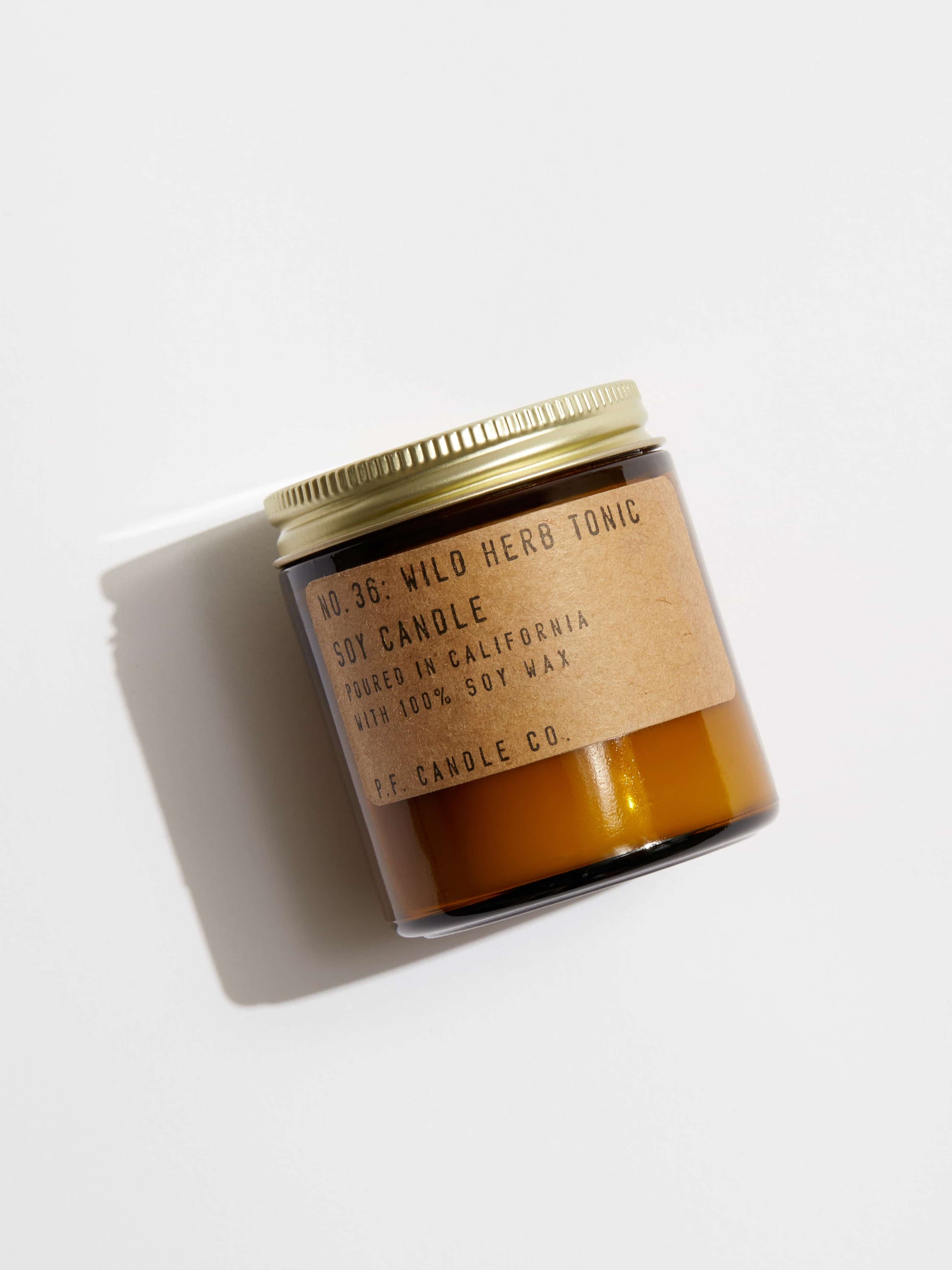 P.F. Candle Co.'s 3.5 oz Mini Candles are packaged in amber jars with their signature kraft label and a brass lid. Perfect for small spaces, trying new scents, or gifting! Available in six best-selling scents. Invokes feelings of barefoot walks through wild herb gardens, cool mountain stream baths, crisp morning air. Aromatic, camphorous, earthy.